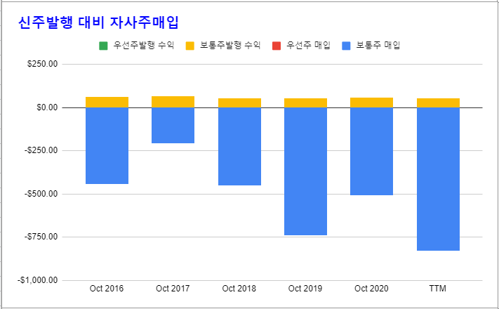 * 신규 발행되는 주식은 매우 적고, 자사주 매입을 꾸준히 하고있다.