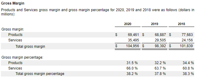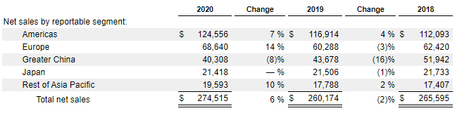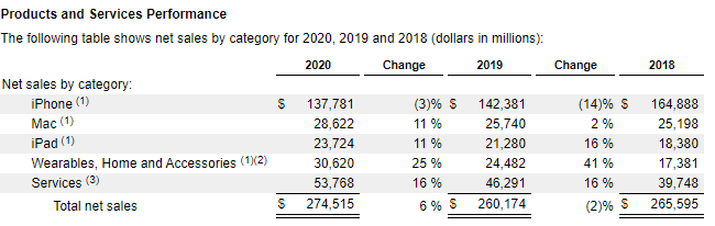 * 웨어러블, 가전, 악세서리(에어팟, 애플 TV, 애플 워치, 비트 제품 - 음향 장비 등) 판매 실적은 2019년에 비해 2020년 판매 실적이 25% 큰폭으로 상승했다.