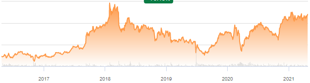 * 지난 5년간 주가의 변동은 아래와 같다.