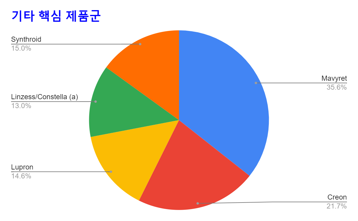 * C형 간염 치료제인 Mavyret과 췌장 외분비 기능의 장애시 복용하는 Creon의 비중이 높다.