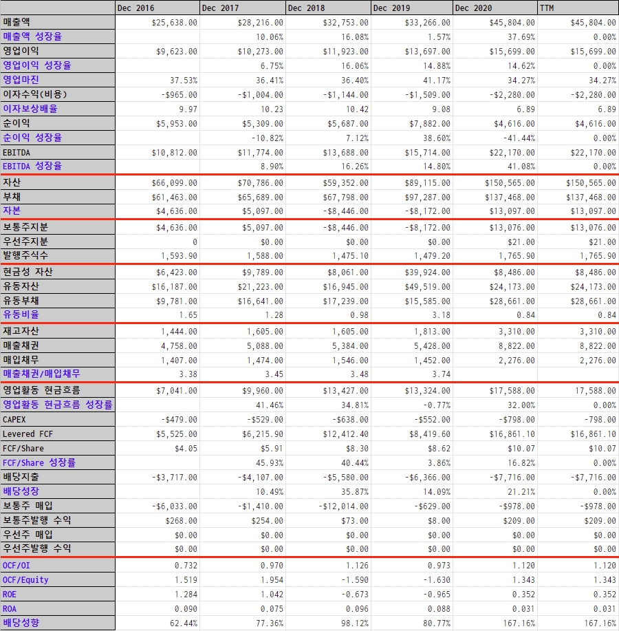 * 이 회사의 2020년 제품 판매 매출은 $45,804,000,000(458억달러, 약 51조원) 이다.