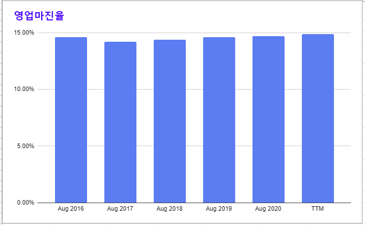 * 영업마진율은 15%를 조금 못 미치는 수준이다.