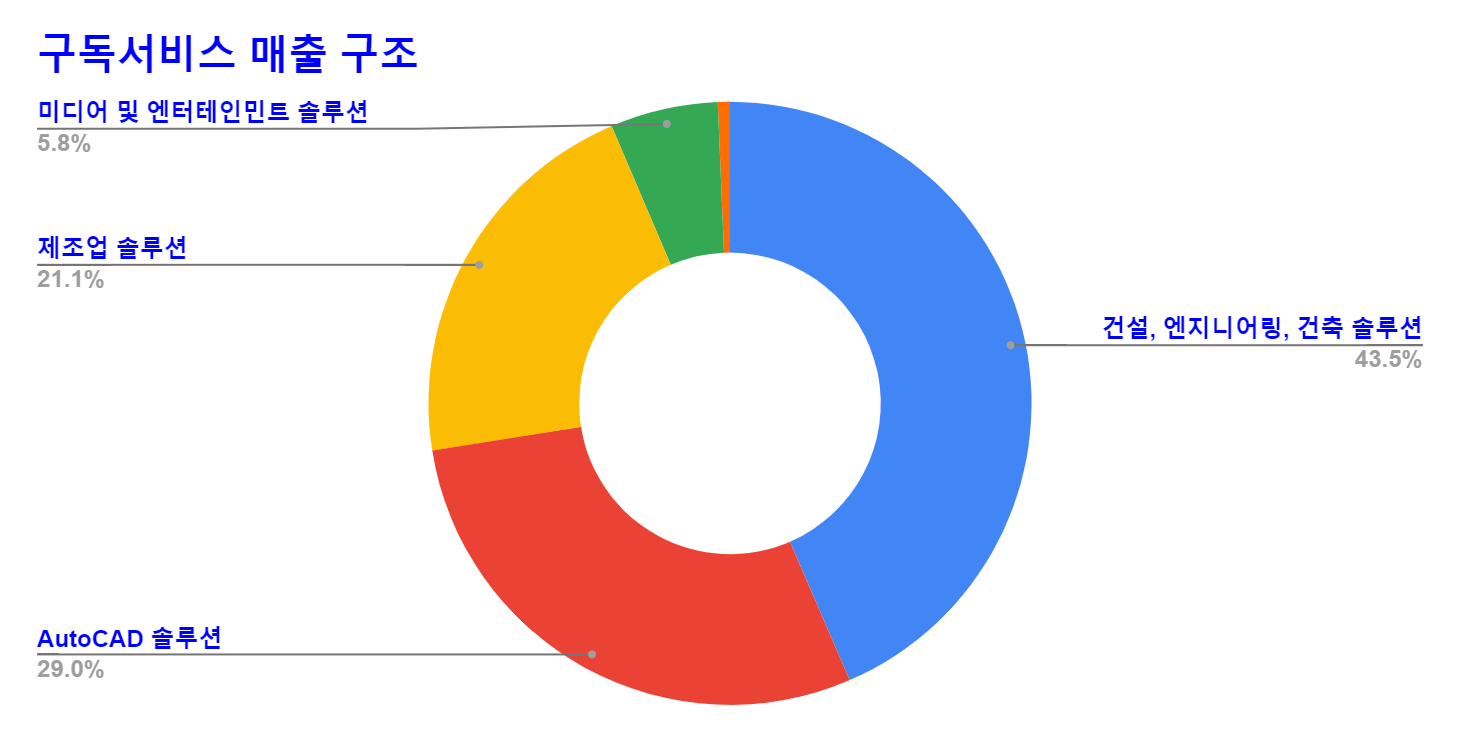 * 2020년 구독 서비스에서의 매출 구조는 '건설, 엔지니어링, 건축 솔루션'의 비중이 43.5%, 오토캐드 솔루션에서 29.0%, 제조업 솔루션 2.1%, 미디어 및 엔터테인먼트 솔루션에서 5.8%를 차지한다.