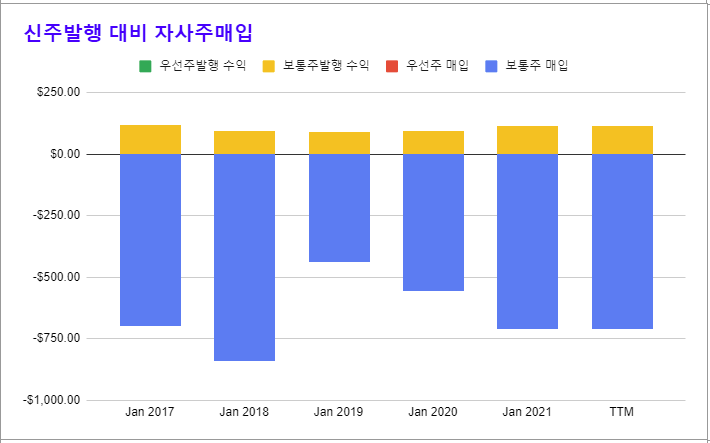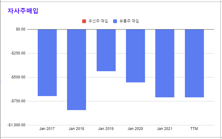 * 2020년 기준 순이익의 약 58% 정도(7억 840만 달러)를 자사주 매입에 사용했다.