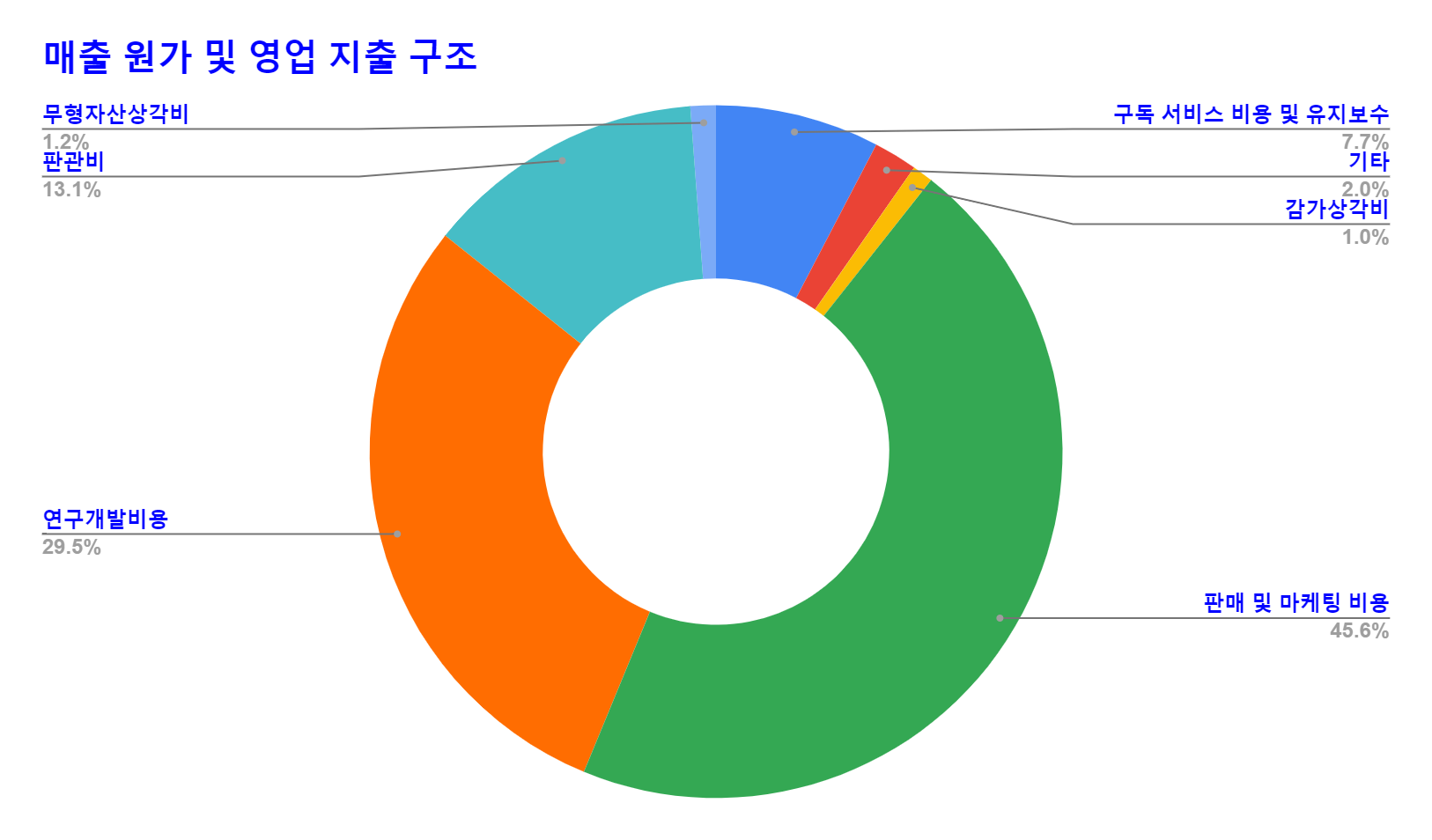 * 판매 및 마케팅 비용이 45.6, 연구 개발비용 29.5%, 판관비 13.1%를 차지한다. 이 세 가지 비용이 대부분의 비중을 차지하고 있다.