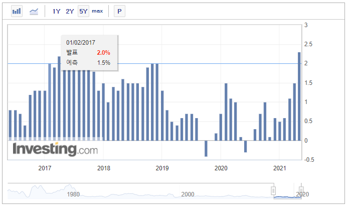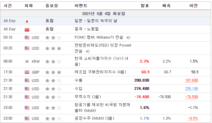 * 한국의 4월 CPI YoY 증가율은 예상보다 0.1% 높게 발표되어 2.3%의 상승을 보였다. 전년도 동월의 CPI의 YoY 상승률이 0.1%였던 점을 감안하여 기저효과도 있음을 생각해봐야 한다.