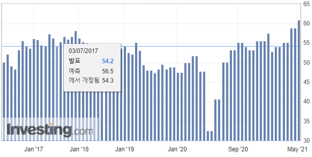 * 영국의 4월 PMI 지수는 60.9로 발표되어 예상치보다 0.2 높게 발표되었다. 전월 PMI는 58.9 였다.
