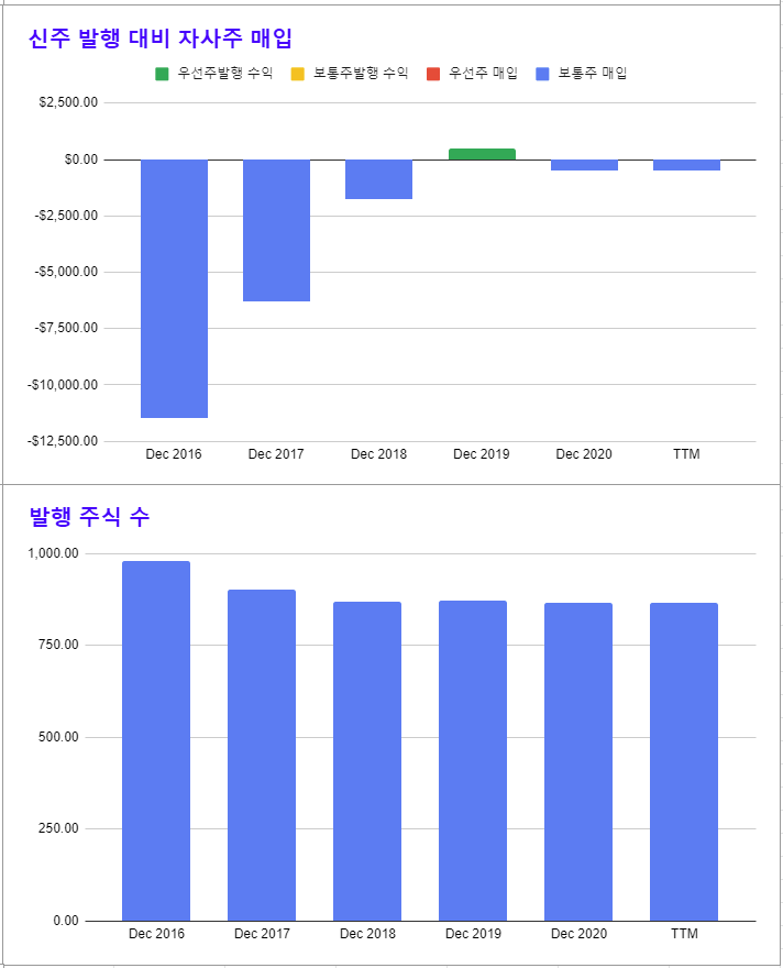 * 회사가 어려워 지면서 자사주 매입이 거의 없는 수준으로 됐다.