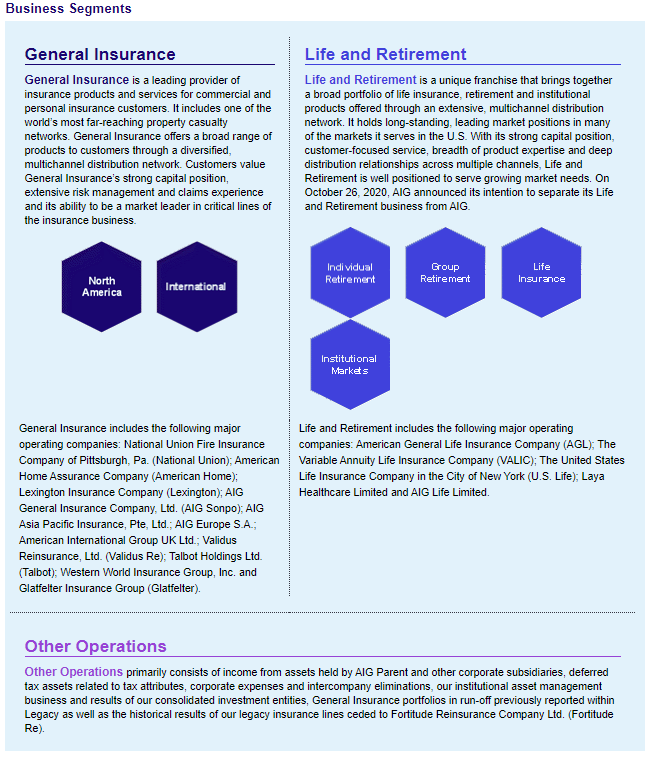 * 130여 개국에서 보험 사업을 하고 있으며, 상업, 기관, 개인 등 여러 경제 주체들을 상대로 손해 보험, 생명 보험, 은퇴 연금 상품 등을 판매하고 있다.