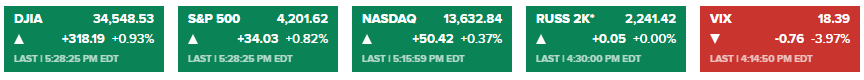 * 주요 지수 상승 마감 : 다우 +0.93%, S&P500 +0.82, 나스닥 +0.37%, 러셀2000 +0%