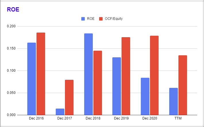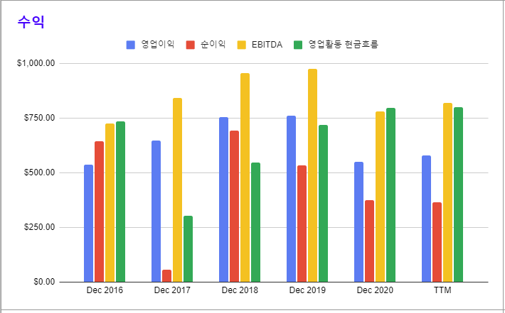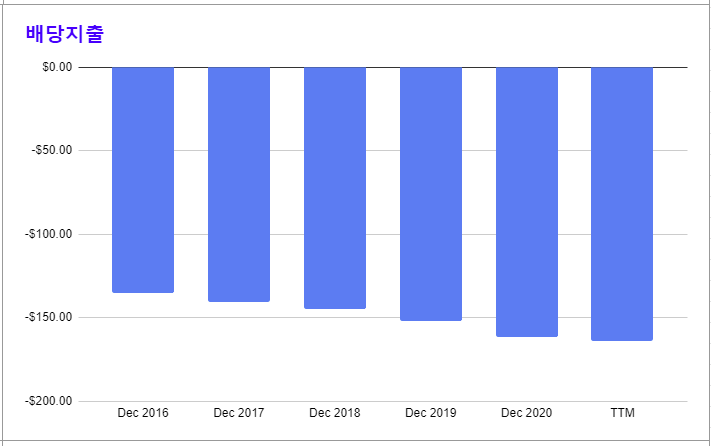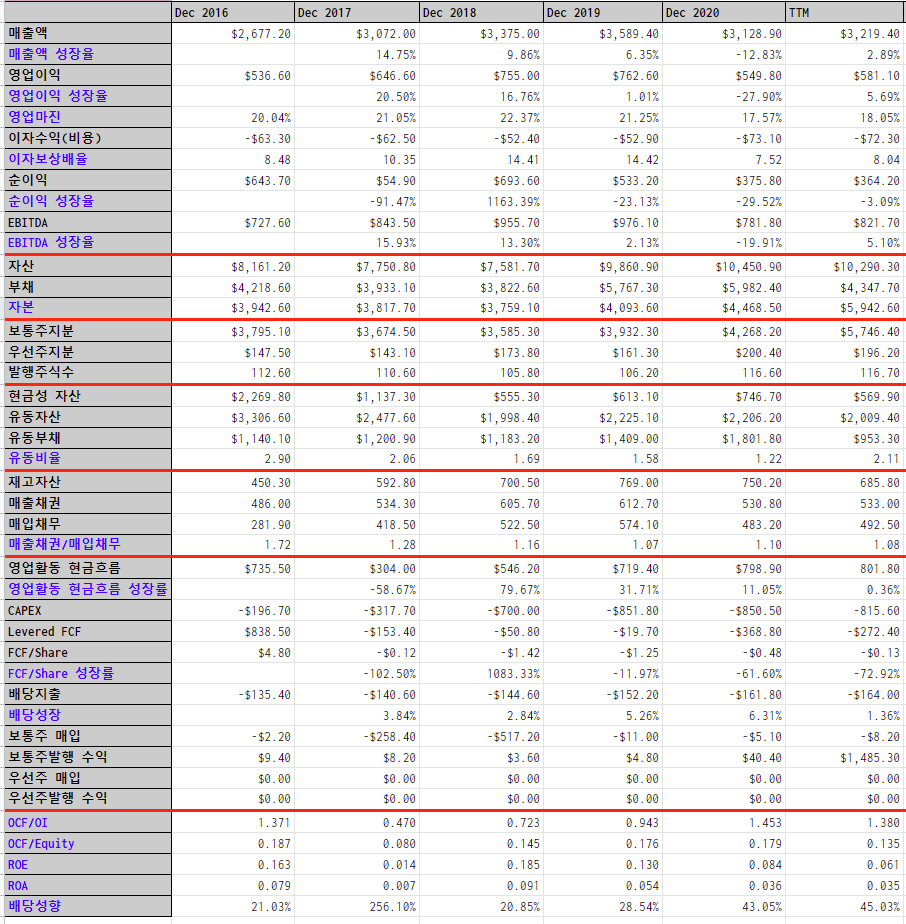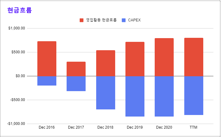 * 이 회사의 영업활동 현금흐름은 꾸준히 발생하고 있으나, 회사의 지속을 위해서 많은 CAPEX 투자가 지속적으로 이루어 져야 하는 것으로 보인다. 따라서 잉여현금흐름은 남는 것이 없다.