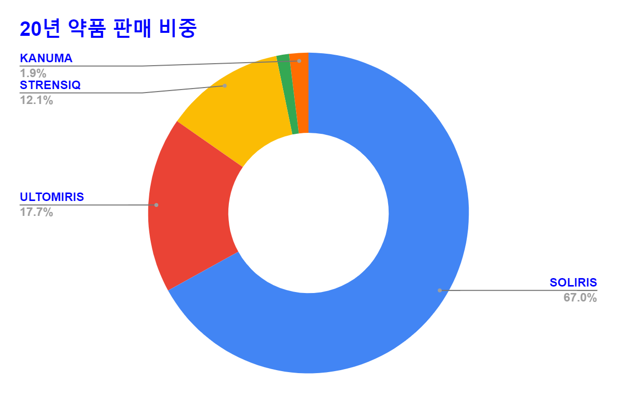 * 솔리리스(발작성 야간 혈색소뇨증, 비정형 용혈성 요독 증후군, 전신 중증 근무력증, 시신경 척수염 범주 질환)에 사용되는 약품의 매출 비중이 67%로 많인 비중을 차지한다.