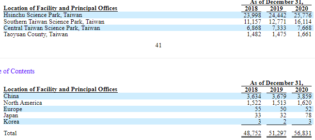 * 2020년 기준 회사의 임직원은 총 56,831명에 달하며, 생산 및 연구 시설의 대부분 대만에 위치하고 있다.