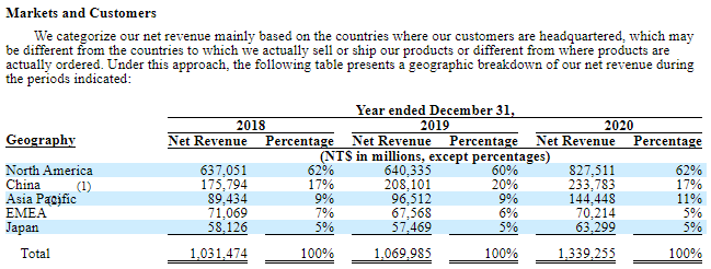 * 매출은 북미에서 60% 이상의 매출이 발생한다. 중국에서 17% 아시아 태평양 지역(일본, 중국을 제외한)에서 11%, 중동, 유럽, 아프리카 지역에서 5%의 매출이 발생한다. 일본에서 5%의 매출이 발생한다.